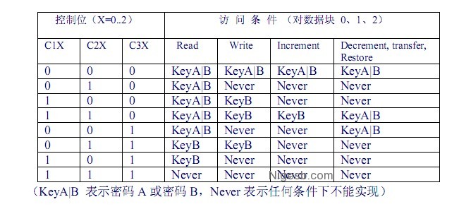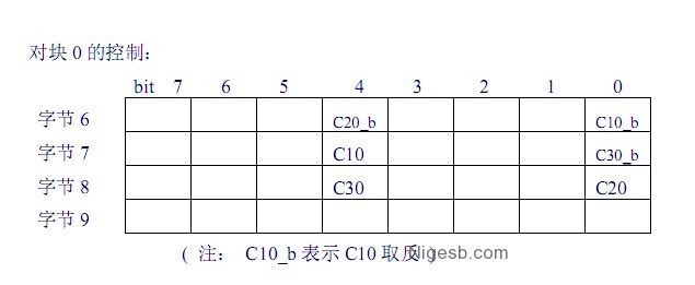 (6). 三个控制位以正和反两种形式存在于存取控制字节中,决定了该块的访问权限(如进行减值操作必须验证KEY A,进行加值操作必须验证KEY B,等等)。三个控制位在存取控制字节中的位置,以块0 为例: