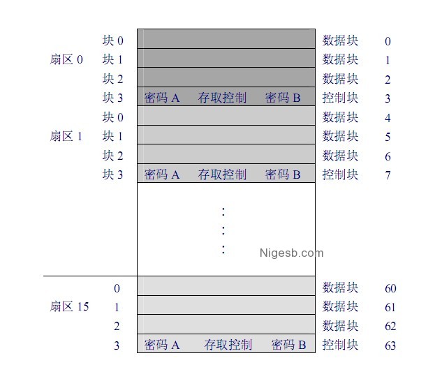 分为16 个扇区,每个扇区为4 块,每块16 个字节,以块为存取单位