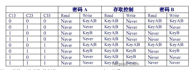(5). 每个扇区的密码和存取控制都是独立的,可以根据实际需要设定各自的密码及存取控制。存取控制为4 个字节,共32 位,扇区中的每个块(包括数据块和控制块)的存取条件是由密码和存取控制共同决定的,在存取控制中每个块都有相应的三个控制位,定义如下: