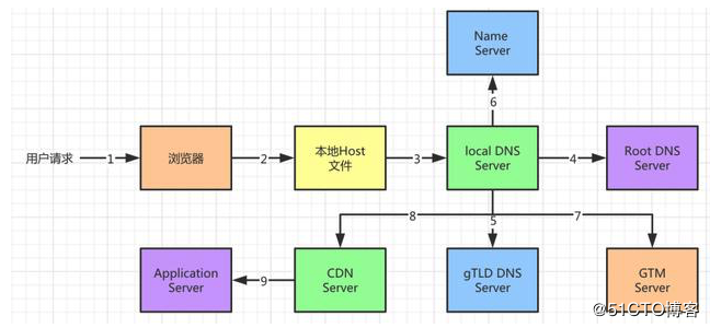 申请域名的供应商会提供Name Server作为DNS解析。从用户访问一个网站出发,经过浏览器,本地Host文件、Local DNS Server、Root DNS Server、顶级域名服务器(gTLD、ccTLD、New gTLD)、Name Server、GTM、CDN、Application Server。共经历了九个步骤。